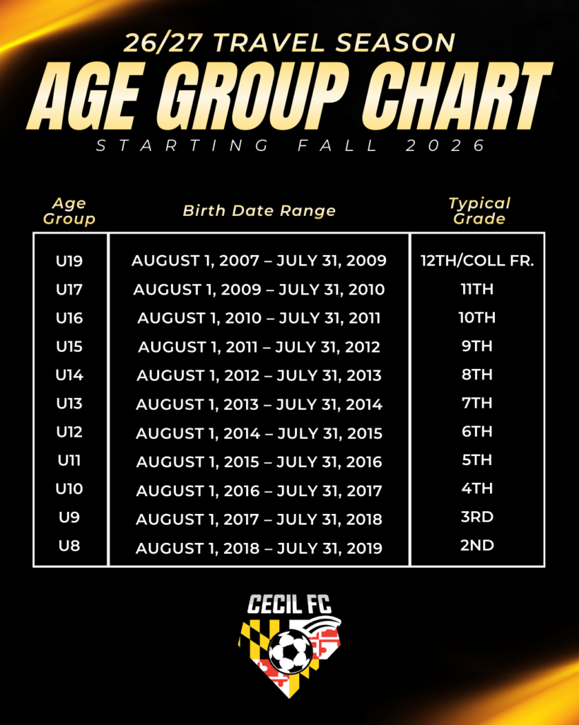 Note birth year changes for the 2026/27 season, starting in the fall Cecil FC will follow this age group chart.